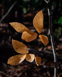 These photos were made last Saturday. A few windy days since mean that the only color remaining in the woods are the browns of oak and beech leaves and the gray of the boles. Both of these tree species will keep their leaves more-or-less until spring.