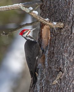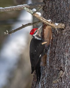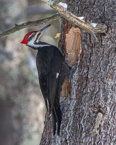 This morning Joan headed out to clear the inch or so of new snow that arrived overnight. She quickly came back inside to report that there was a pileated woodpecker low down in a tree near our garage. I gathered up tripod, camera and ‘Big Bertha’, my 600 mm telephoto lens and headed out to the driveway just outside the garage.