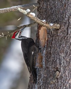 I spent about a half hour watching a male pileated woodpecker excavate a typical rectangular gallery in a pine tree while feeding on the carpenter ants it exposed. I made about 700 (!) exposures in the half hour mostly in small bursts. I was hoping to capture a few flying wood chips in addition to a nice pose of the bird.