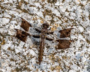 After about an hour’s R&R at home to get refueled and re-hydrated I headed out again, this time on foot. By this time, the skies were partly cloudy and the temperature was still about 80 F. I walked up Brimstone Corner Road and down Castor Lane, the road through the Harris Center property near our house. As it was earlier, chalk-fronted corporals were common in every sunny spot along the road. As I neared the spot where the water leaving the beaver pond goes under the road, I was glad to see two Ebony Jewelwings flutter up into the trees. This species is often present in large numbers in the small stream below the beaver dam. Alas, there were no more Jewelwings to be found today; I imagine that it is still a bit too early for them.