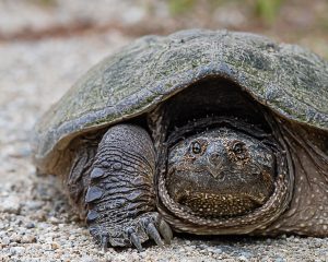 Eventually, I moved on up the road to a sunny and sandy clearing where there are often odes. However, there were none present today. As I was standing there mulling things over, I noticed several small depressions in the sandy soil and thought to myself…. “hmmm, looks like a turtle started to dig a nest”. Looking up, I was surprised to find, not more than a dozen feet from where I stood, a snapping turtle staring up at me! Of course, I made a few photographs; all of which were compromises because of the low, sparse vegetation present in the area.